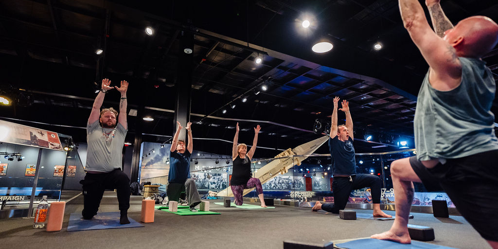 Warrior Yoga at the American Heritage Museum takes place every Wednesday evening from 6:00pm to 7:00pm on the carpeted mezzanine level of the museum, overlooking the main galleries.