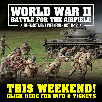 Due to the forecast rain storm, the 11am Re-Enactment on Sunday will be taking place, but the 3pm Re-Enactment is being cancelled. All museum buildings and Indoor activities still open until 5pm today, including the WWII Veterans Roundtable at 1pm. Pricing after 12 noon reduced to $25 Adults / $20 Seniors & Veterans / $15 for Children 16 and Under.